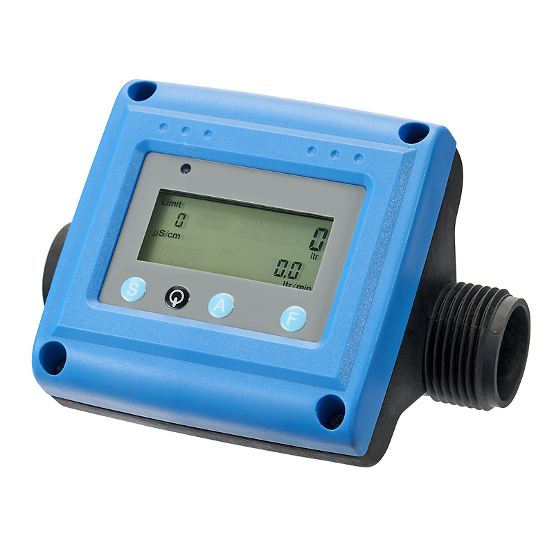 Das FD1 Kombinationsmessgerät zeichnet das Volumen, die Durchflussrate und die Leitfähigkeit/TDS des produzierten demineralisierten Wassers auf.